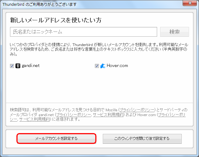 2つのプロバイダのチェックを外して[メールアカウントを設定する]ボタンをクリックします。