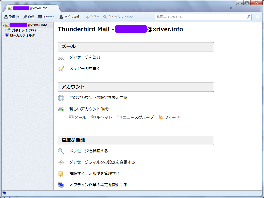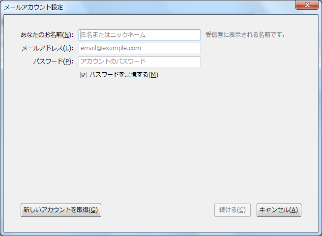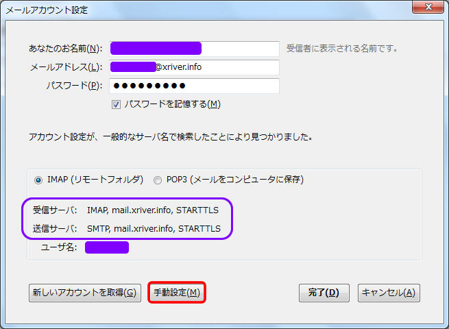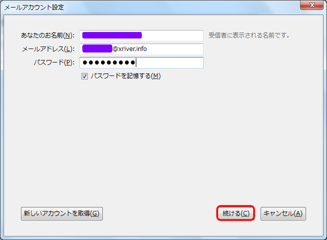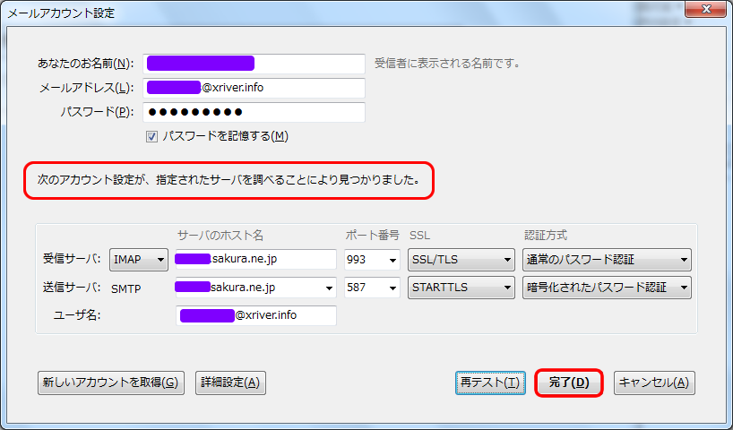 Mozilla Thunderbirdによって「受信サーバ、送信サーバ」の設定が自動的に行われますが、