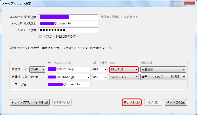 サーバの設定画面が表示されますので、以下のように設定して[再テスト(T)]ボタンをクリックします。