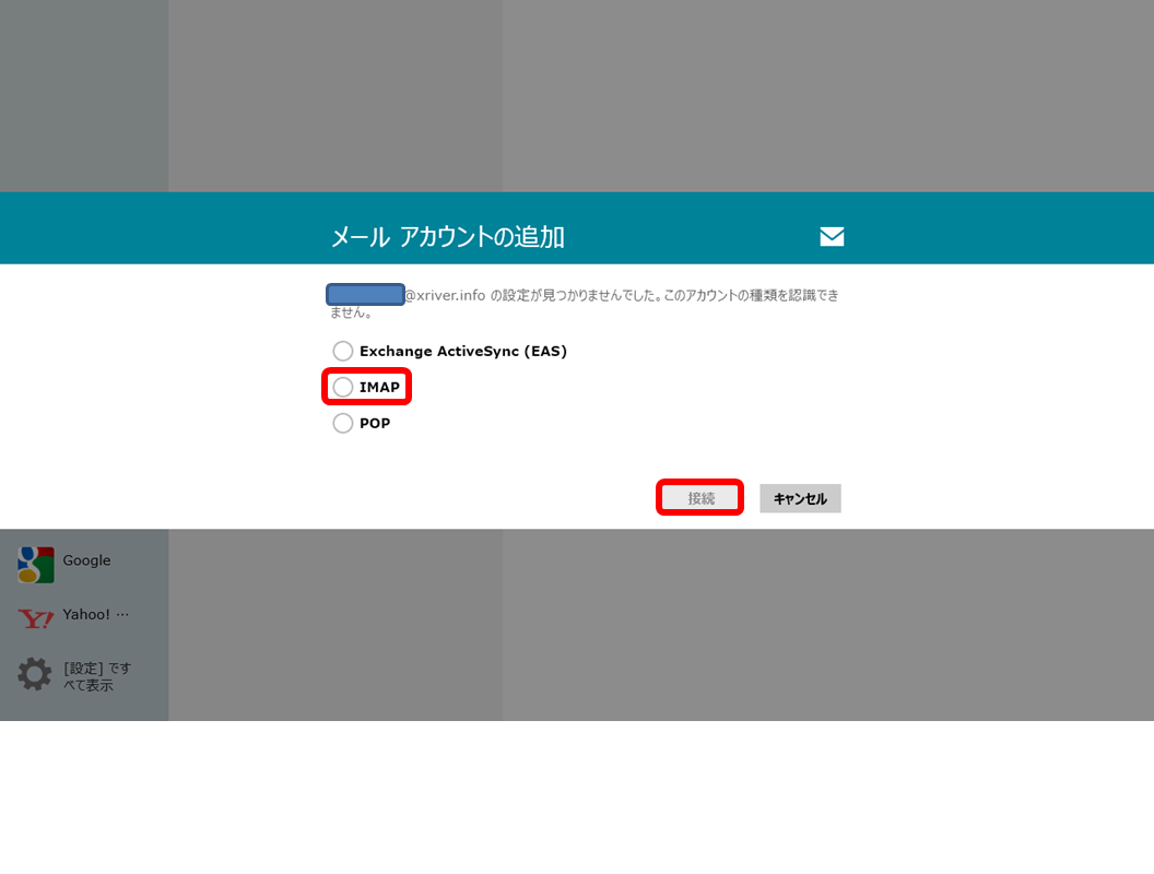 「メールアカウントを追加」画面では「○IMAP」を選択して[接続]ボタンをクリックします。