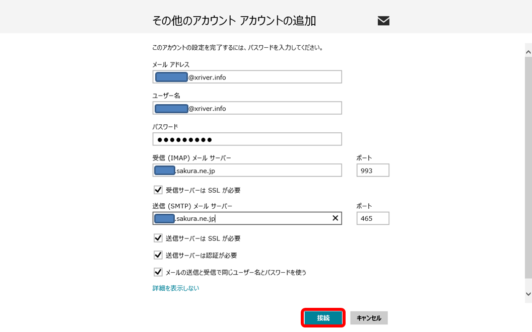 この画面では以下の項目を入力して[接続]ボタンをクリックします(ポート番号は変更する必要はありません)。